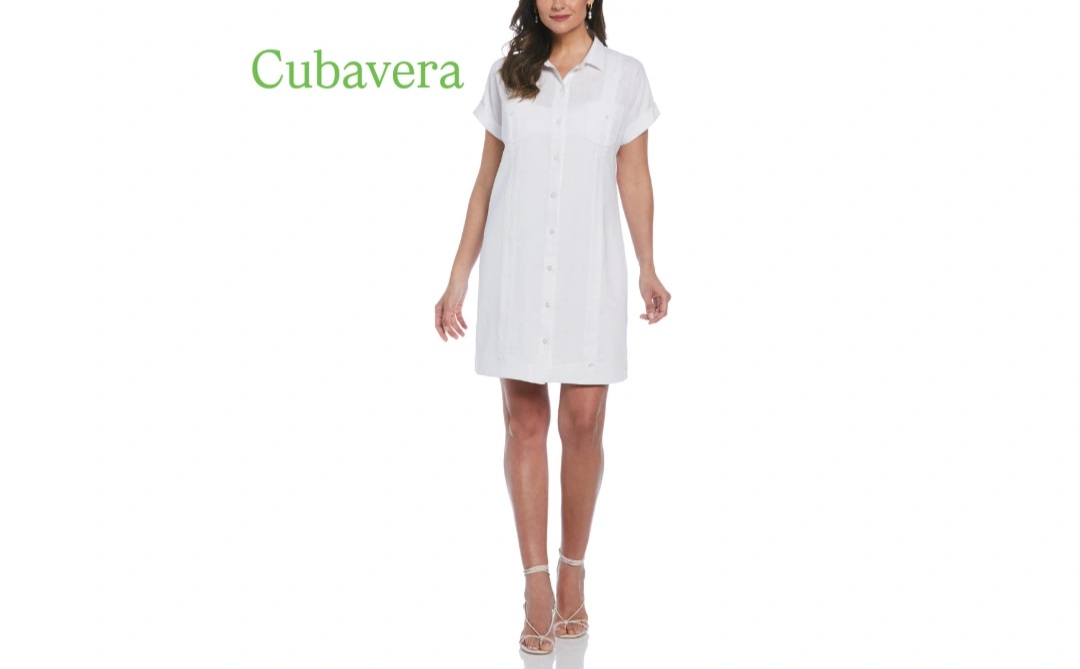 Tienda BKOOL presenta Cubavera Guayabera Vestido, este vestido estilo guayabera para mujer de Cubavera es una elegante fusión del estilo tradicional de la guayabera y la moda contemporánea de inspiración cubana, esta confeccionado para brindar confort en climas cálidos, cuenta con un tejido transpirable de lino y viscosa, cierre frontal abotonado, cuello de punta y dos bolsillos en el pecho, su diseño chic, inspirado en la camisa guayabera, confiere a este vestido de verano una estética única, perfecta para salidas diurnas.