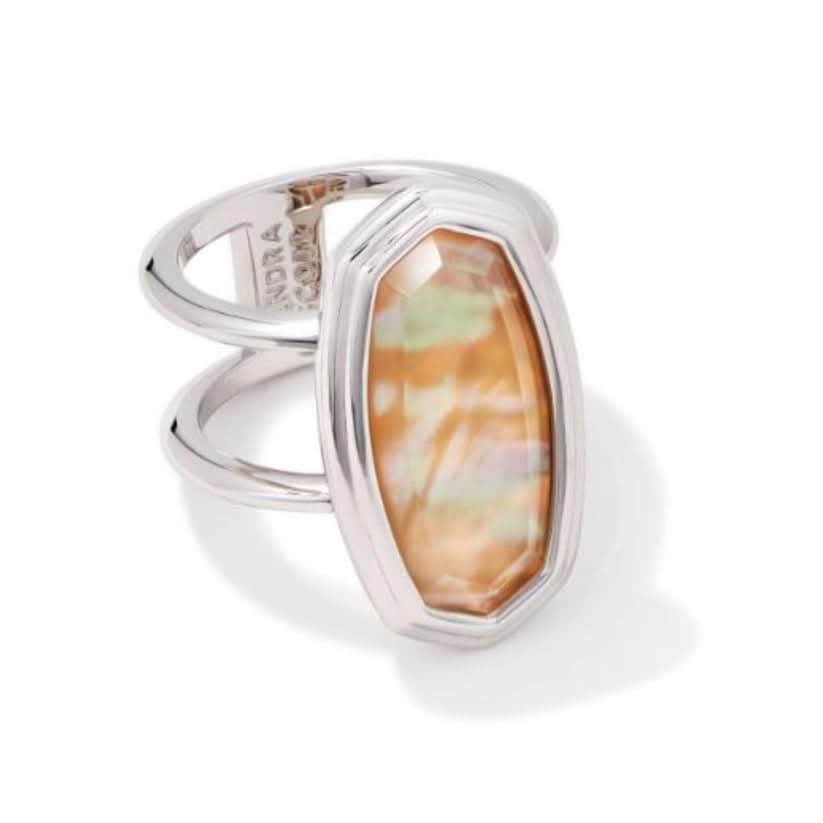 Tienda BKOOL presenta Kendra Scott Framed Rhodium Cocktail Ring In Golden Abalone, con una piedra de abulón dorado facetada, el anillo de cóctel de Plata Dani enmarcado es una declaración moderna que buscará a diario, uselo solo o junto con sus anillos minimalistas favoritos.