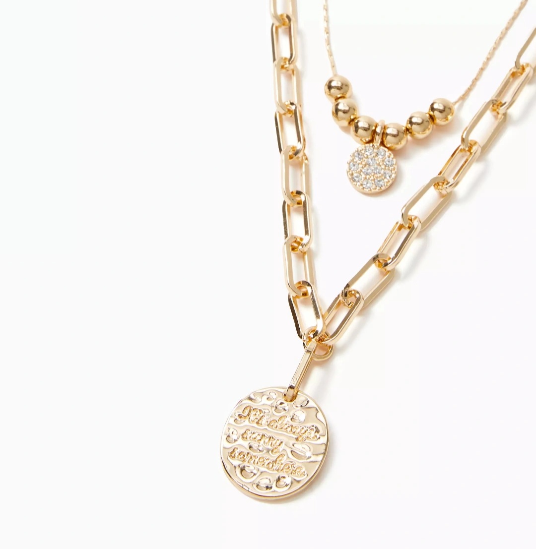 Collar de cadena doble capa con dijes de monedas pavimentadas y martilladas, el collar interior mide aproximadamente de 18″ el collar exterior mide aproximadamente 22″ de largo con un extensor de 3″, el colgante mide aproximadamente 0.9″ las joyas se empaquetan en una bolsa impresa de la marca.