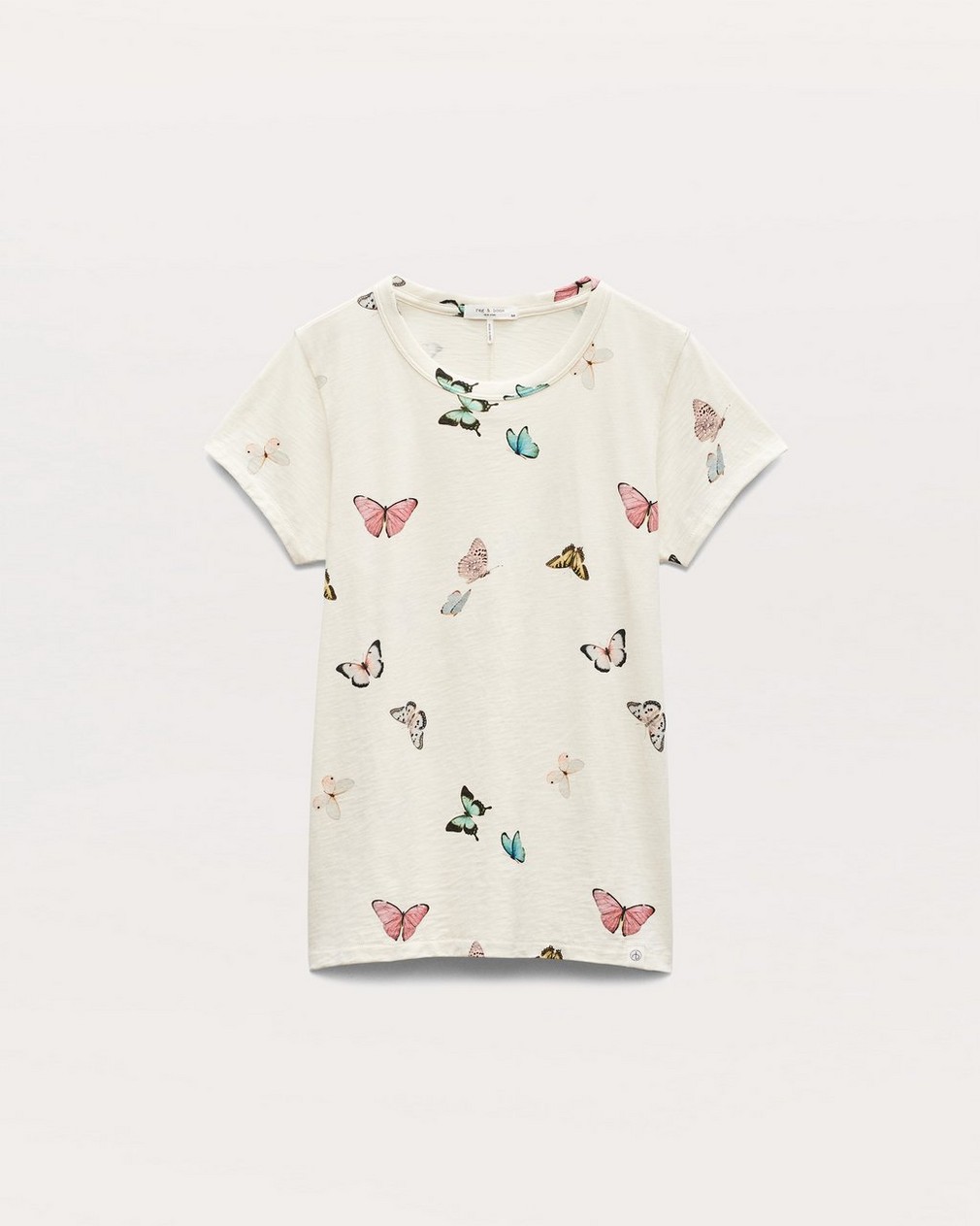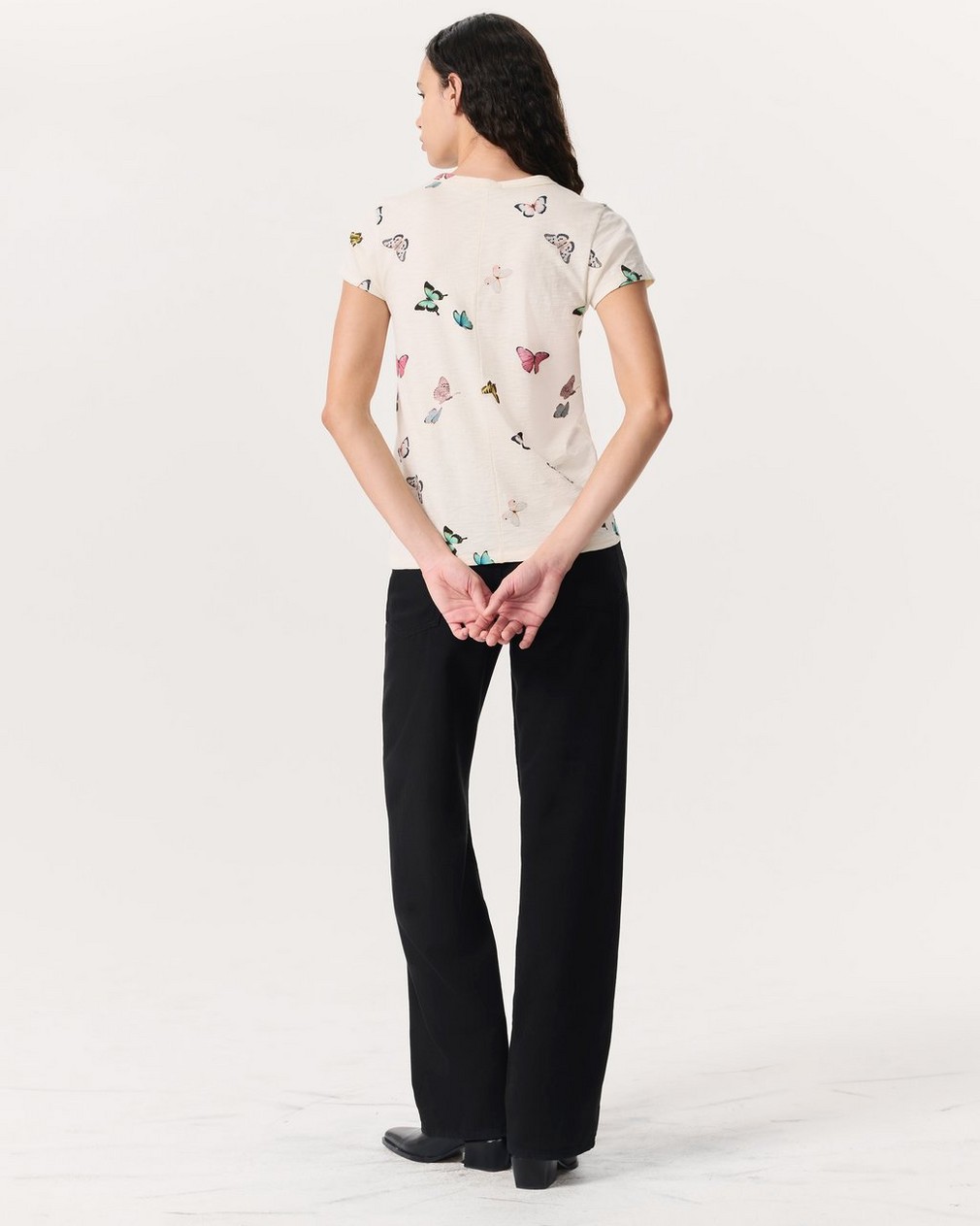 mariposas coloridas con estampado digital revolotean sobre esta camiseta de cuello redondo, confeccionada con un corte clásico en una mezcla de algodón prima peruano elástico, esta hecha en 88% algodón, 10% poliéster, 2% elastano.