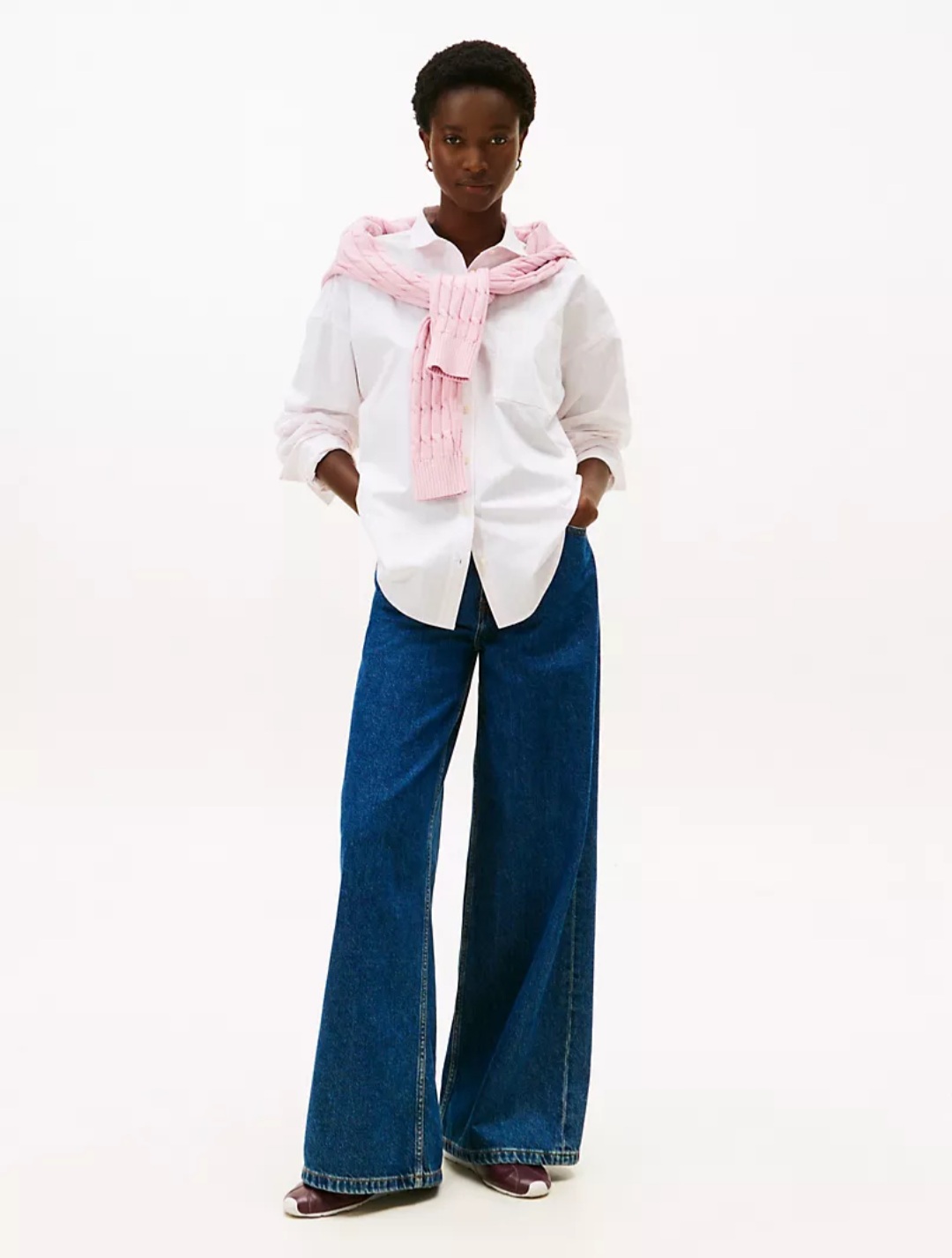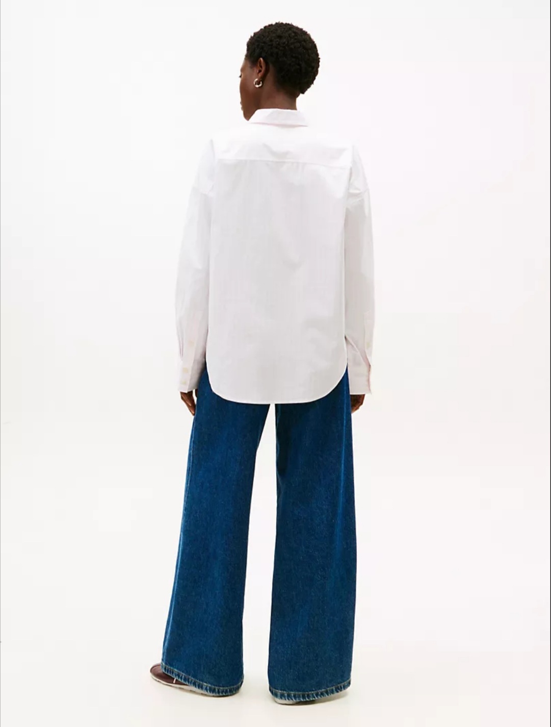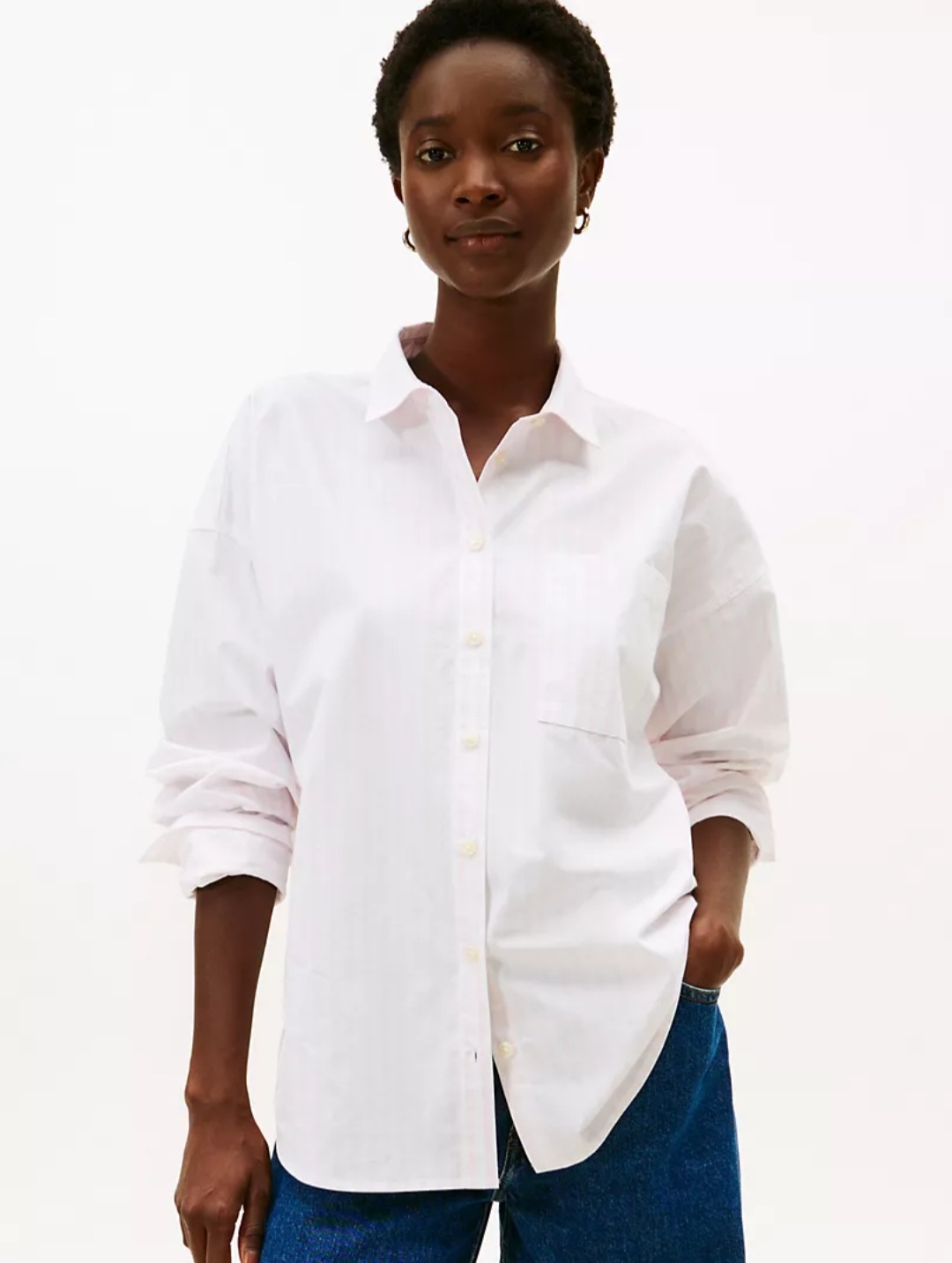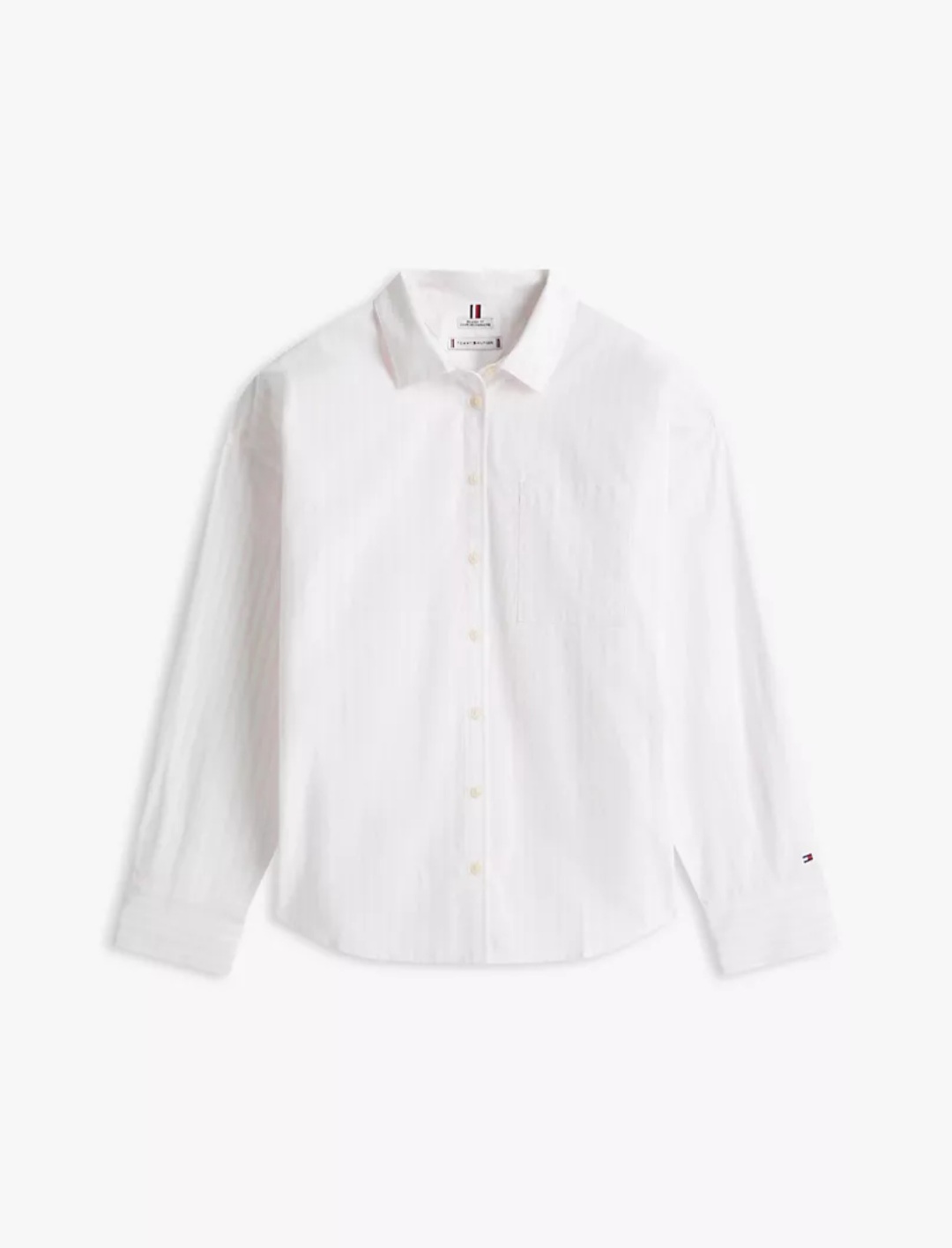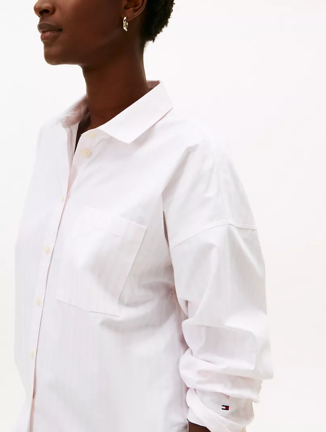 Tienda BKOOL presenta Tommy Hilfiger Relaxed, camisa de mujer TH en color rosado bajo a rayas confeccionada en popelina de algodón puro y con un corte holgado, esta camisa de rayas es una prenda versátil ideal tanto para la oficina como para escapadas de fin de semana con detalles como cuello clásico, cierre de botones, mangas largas, bolsillo de parche en el pecho con un largo desde el punto más alto del hombro de 70cm. Medidas basadas en la talla S de corteholgado, esta hecha en 100% algodón.